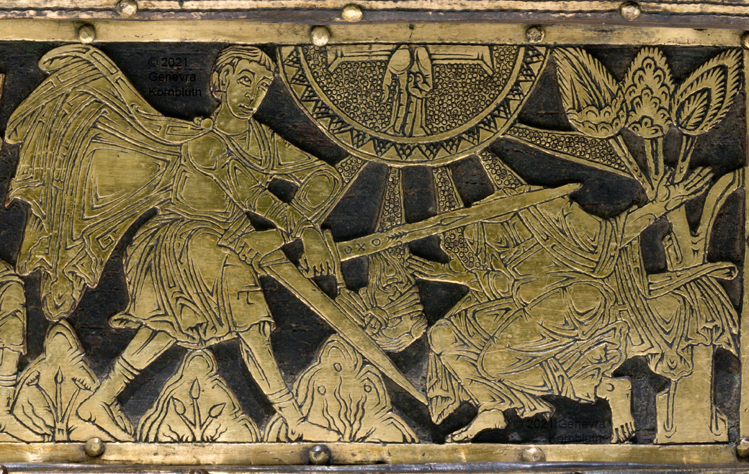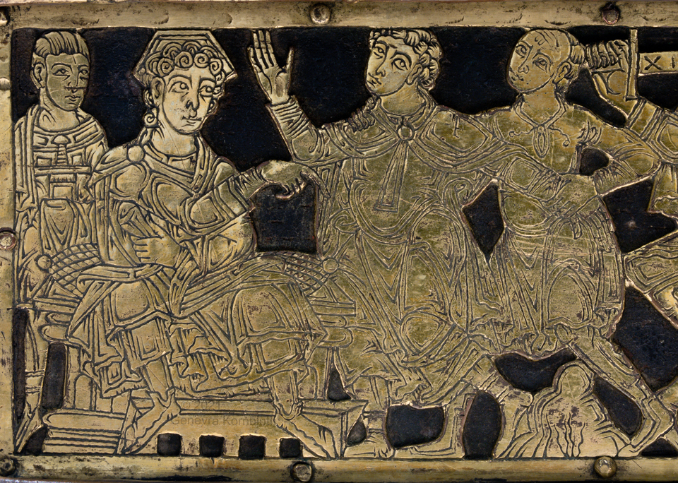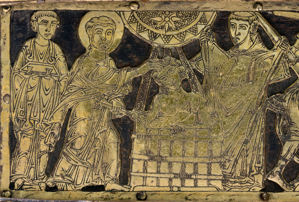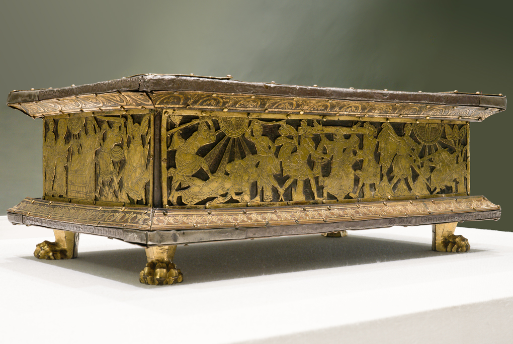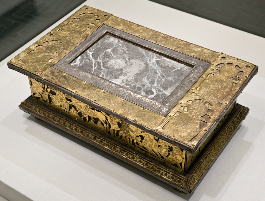 Historical Archive: Abdinghof Altar Portable altar from Kloster Abdinghof Westfalia or Weser region, 1115-1130 often attributed to Roger of Helmarshausen openwork gilt copper on painted oak core; feet gilt cast bronze on iron core 11.8 × 31.1 × 18.5 cm (4.6 x 12.2 x 7.3 inches) silver frame of altar stone 15th c.; stone lost before 1904, modern replacement St. Felix on top probably soon before 1890 loan from Franziskanerkloster to Paderborn Diocesan Museum, PR 50 |
