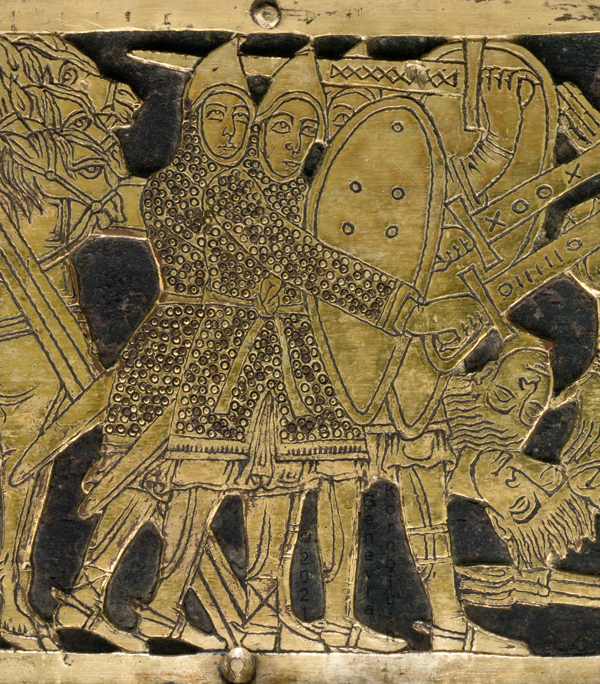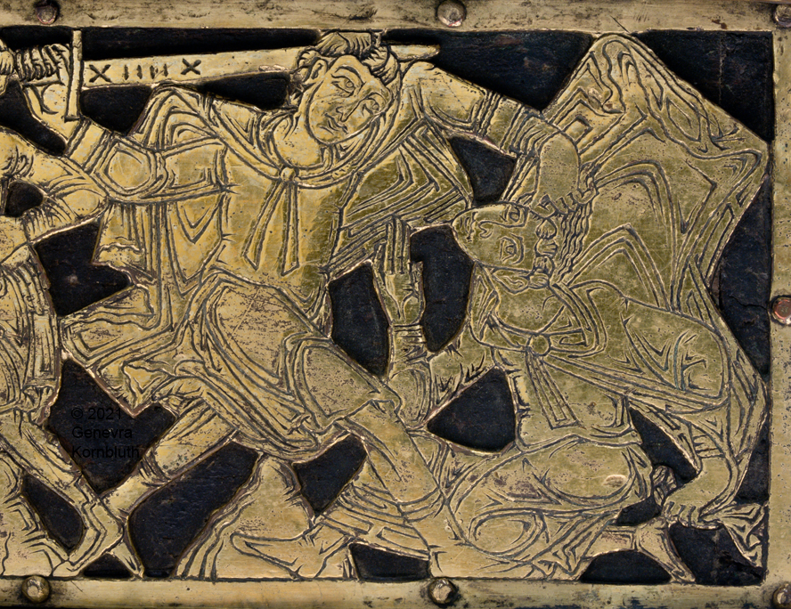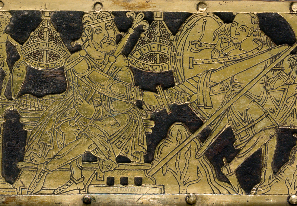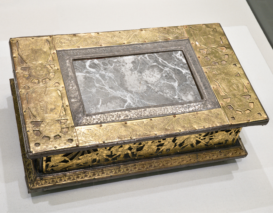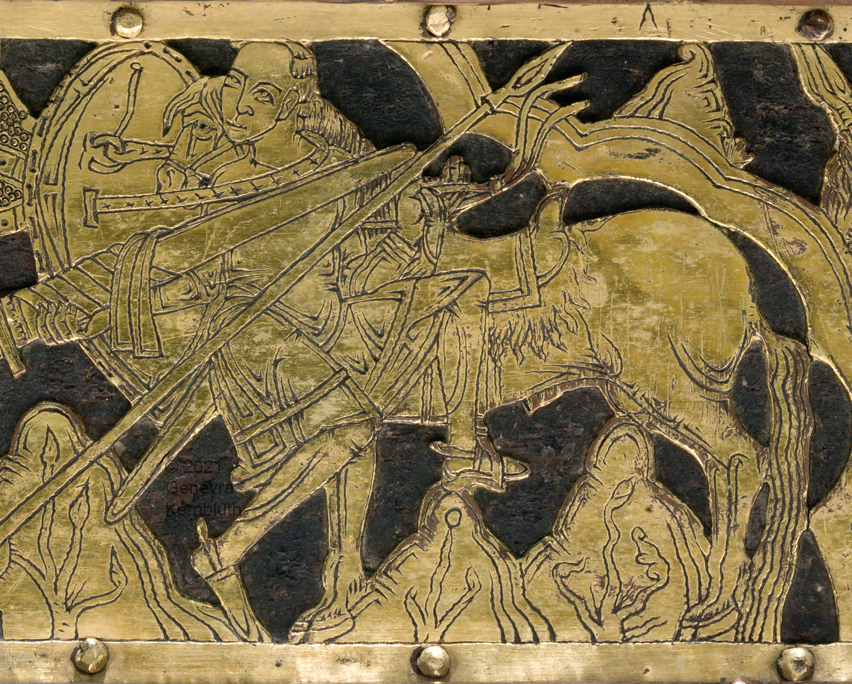 Historical Archive: Abdinghof Altar Portable altar from Kloster Abdinghof Westfalia or Weser region, 1115-1130 often attributed to Roger of Helmarshausen openwork gilt copper on painted oak core; feet gilt cast bronze on iron core 11.8 × 31.1 × 18.5 cm (4.6 x 12.2 x 7.3 inches) silver frame of altar stone 15th c.; stone lost before 1904, modern replacement St. Felix on top probably soon before 1890 loan from Franziskanerkloster to Paderborn Diocesan Museum, PR 50 |