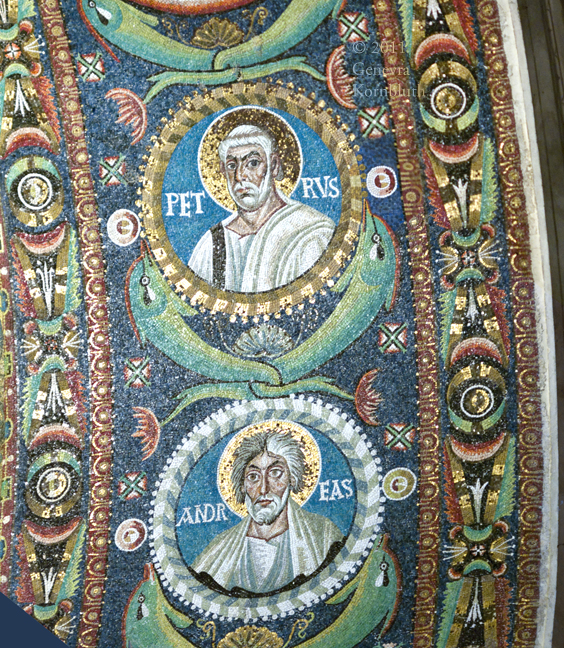 dolphins: presbytery arch mosaic, Ravenna, Church of San Vitale, 527-48. This work has its own interior and exterior pages. Dolphins and fish have their own page.