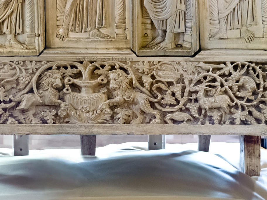 partrige or quail, lower center right: Cathedra of Maximian, ivory, 546-56, RavArchMus, which has its own page