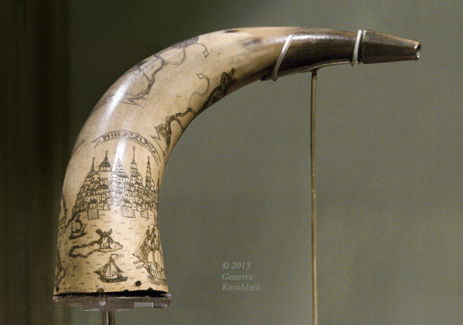 Engraved musket powder horn, cow, ox, or buffalo horn, 18th c. US, UMMA 2007/1.101. This work has its own page.