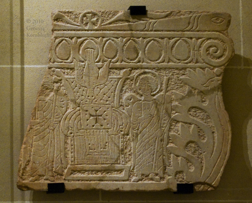 pilaster capital: prepared throne with dove and angels, marble, 5th-6th c., Louvre Ma 3679