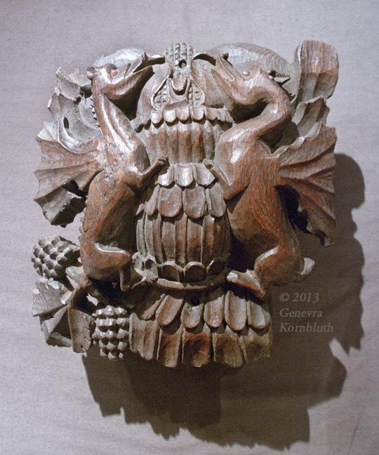 Ceiling boss with dragons, wood with polychrome, England c.1430, prob. from Church of St. Andrews, Cullompton, UMMA 1968/2.46
