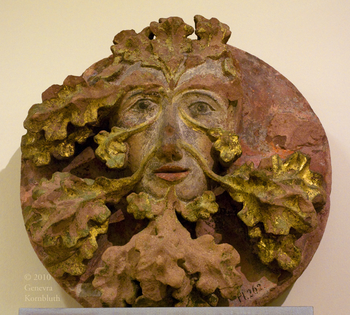 foliate mask (Green Man), sandstone key stone with polychrome, Mainz c.1450, LMM S3125