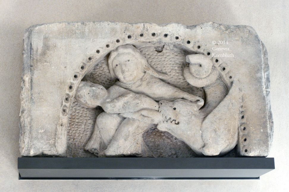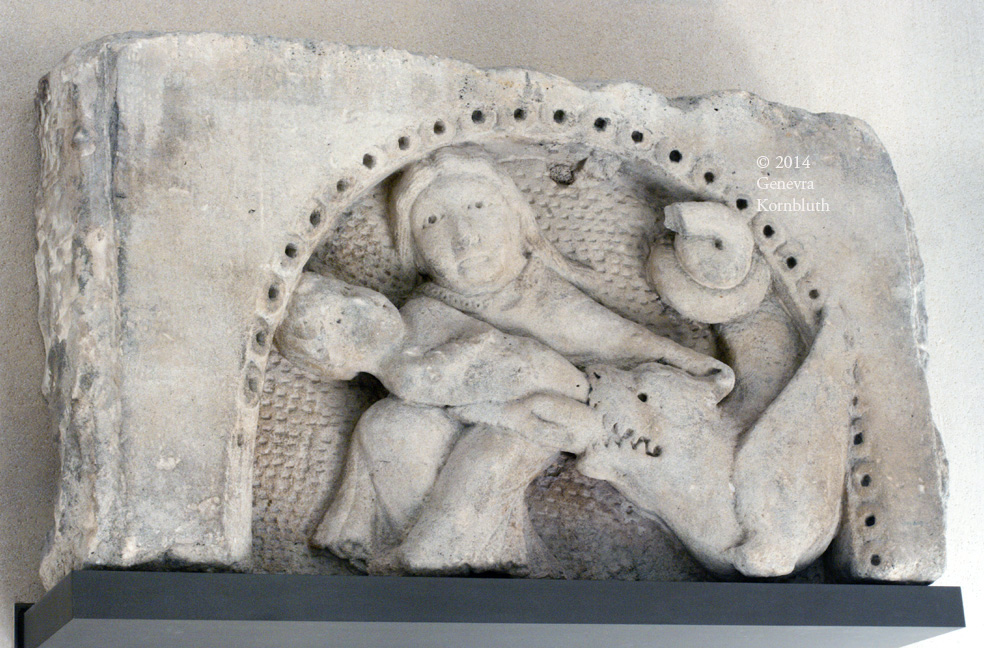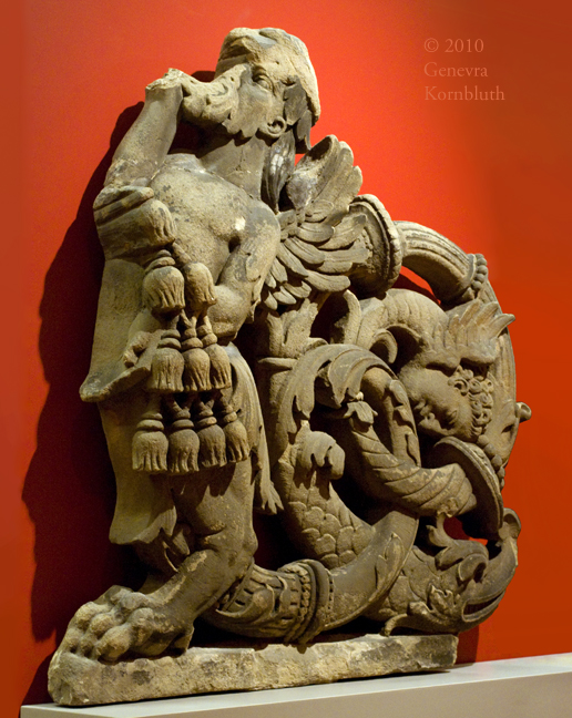 Apocalyptic woman attacked by dragon, from St. Rieul, Senlis; limestone, c.1150-1200; Louvre R.F. 3657