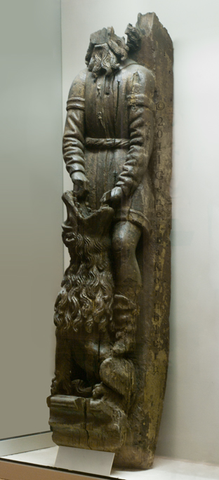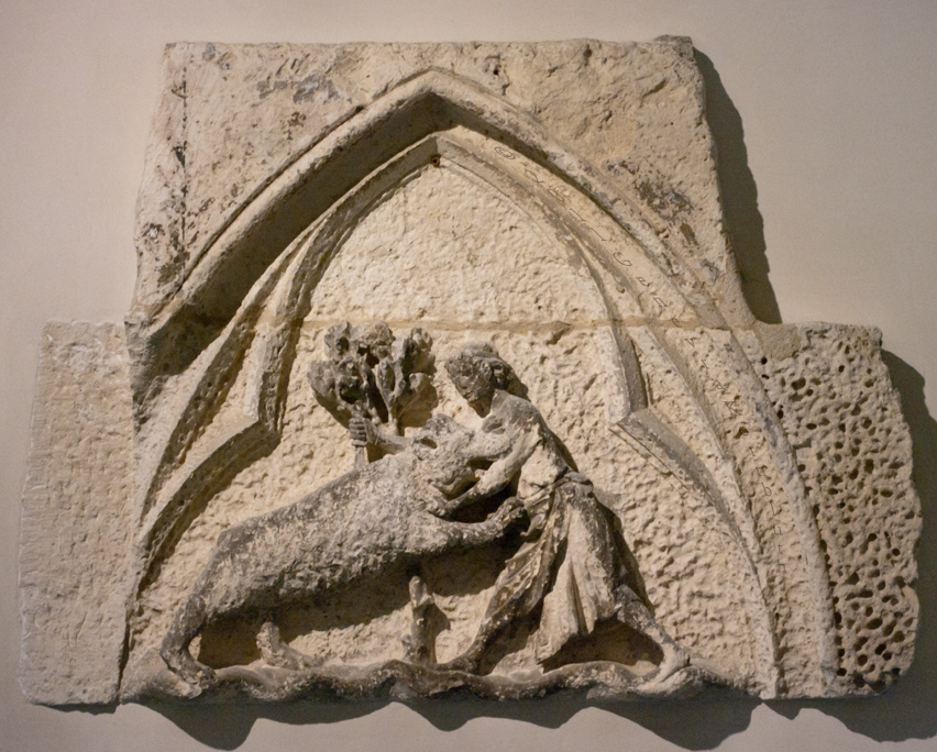 Samson killing the lion, wood, late 15th c. console fr. Maison de l'enfant d'or, Place des Marchés, Reims, Reims MSR