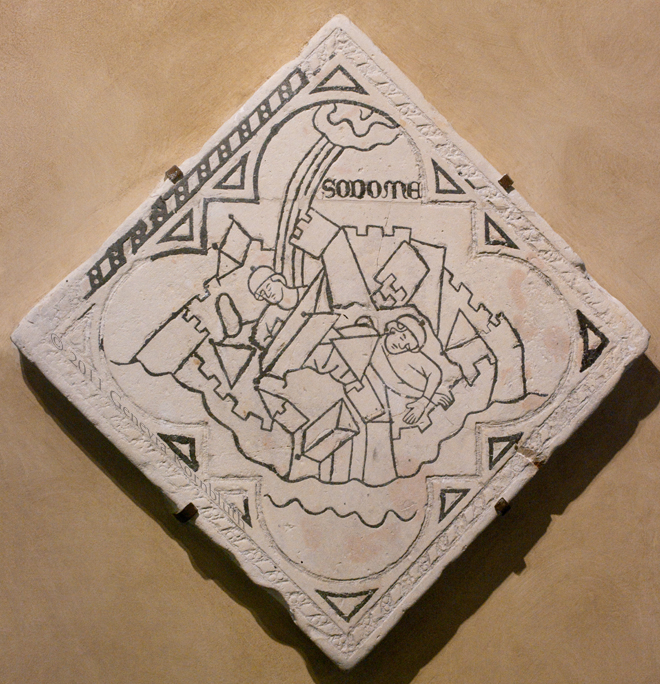 destruction of Sodom pavement tile, limestone/lead, 14th c., fr. St. Nicaise, Reims MSR 978.28594. For detail see Reims.