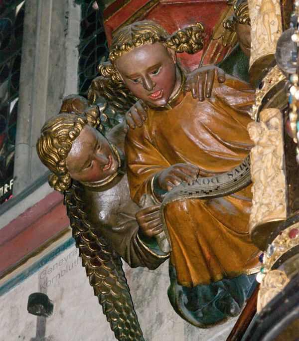 console of standing figure by ambo, sandstone 1430, polychromed 1849, Aachen cathedral choir. The cathedral has its own pages.