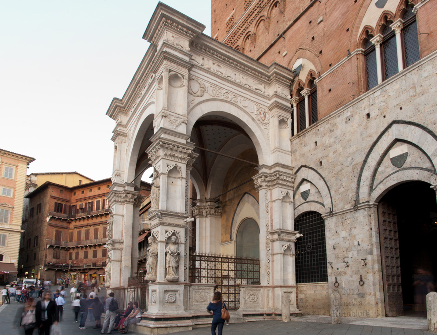 Cappella di Piazza 1325-76, completed by Giovanni di Cecco, iron railings Conte di Lello Orlandi, ceiling 1463-68, Palazzo Pubblico, Siena, which has its own exterior page