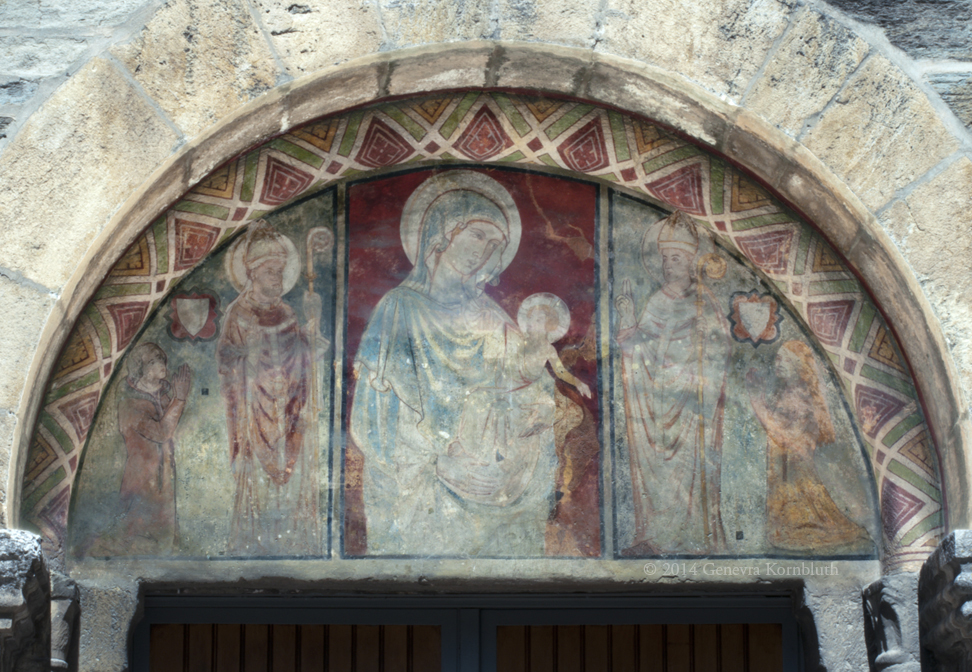 Sion Cathedral, Virgin and child with donors and saintly bishops, 14th-15th c., much retouched. For full portal see Sion cathedral.