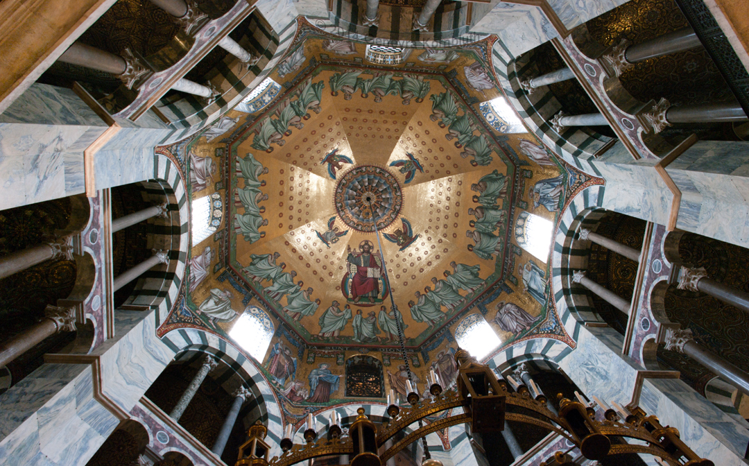 dome mosaic design Jean-Baptiste Bethune 1872 aft. Ciampini 1699, execution Antonio Salviati 1880-81, Aachen cathedral. The cathedral has its own pages.
