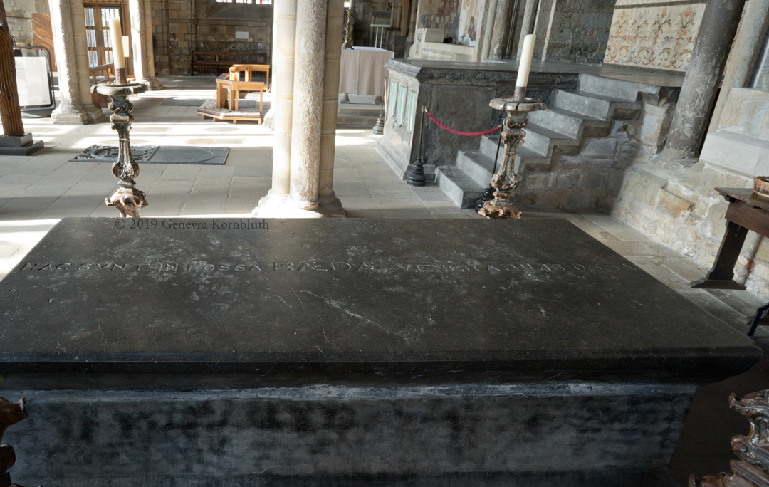 1830s inscription, tomb of Bede 1542, Galilee, Durham Cathedral, which has its own pages