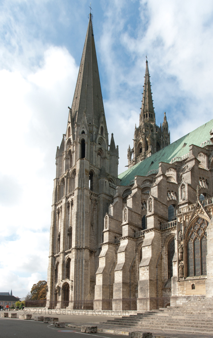 Chartres cathedral, southwest tower spire complete c.1165. For more views see Chartres.