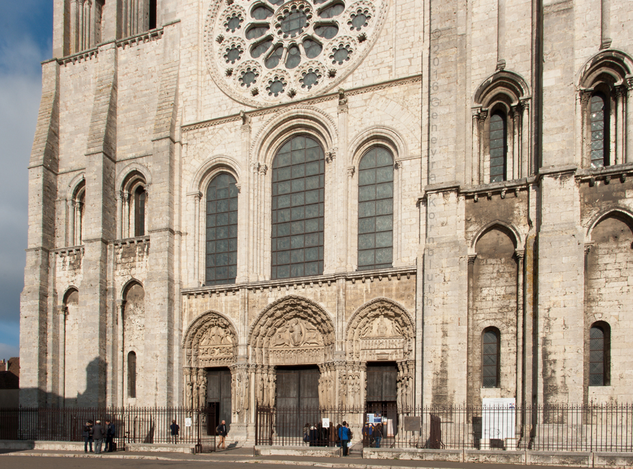 Chartres west façade center, lower parts of towers 1140s-c.1150. For more views see Chartres.