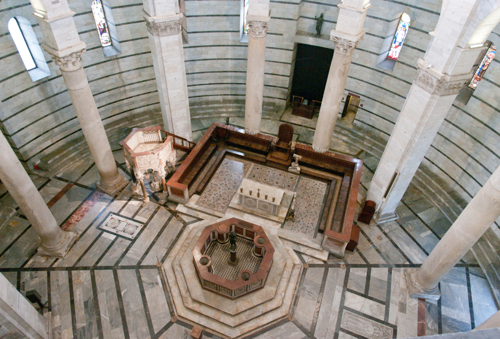 Pisa baptistery lower level Diotisalvi 1152-70, at Pisa cathedral, which has its own page, in cathedral complex