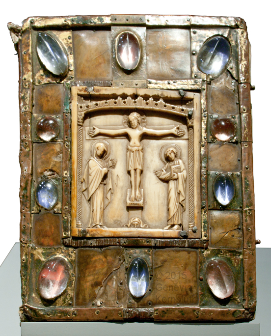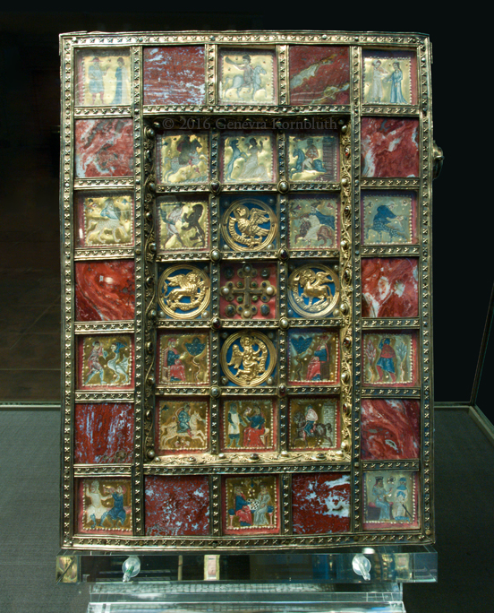 Small Bernward Gospels cover, oak core/gilt copper/rock crystal/painted parchment under horn, Hildesheim 12th c. with Byzantine ivory 10th c., HildMus DS13. For other views see HildMus.