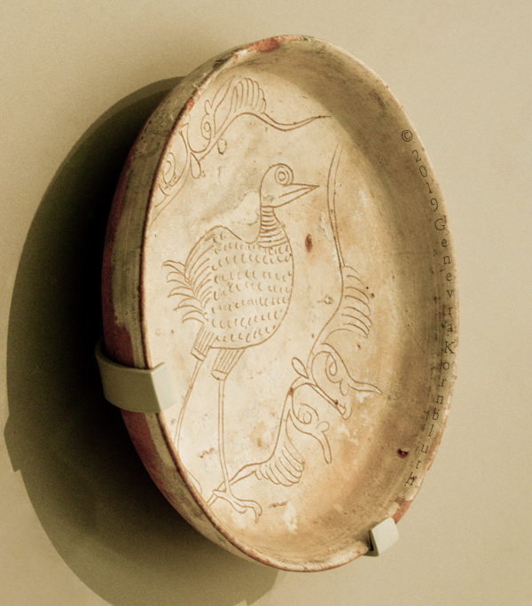 Byzantine sgraffito ceramic bowl with wading water bird, oblique view, c.1125-75, V&A C.20-1970