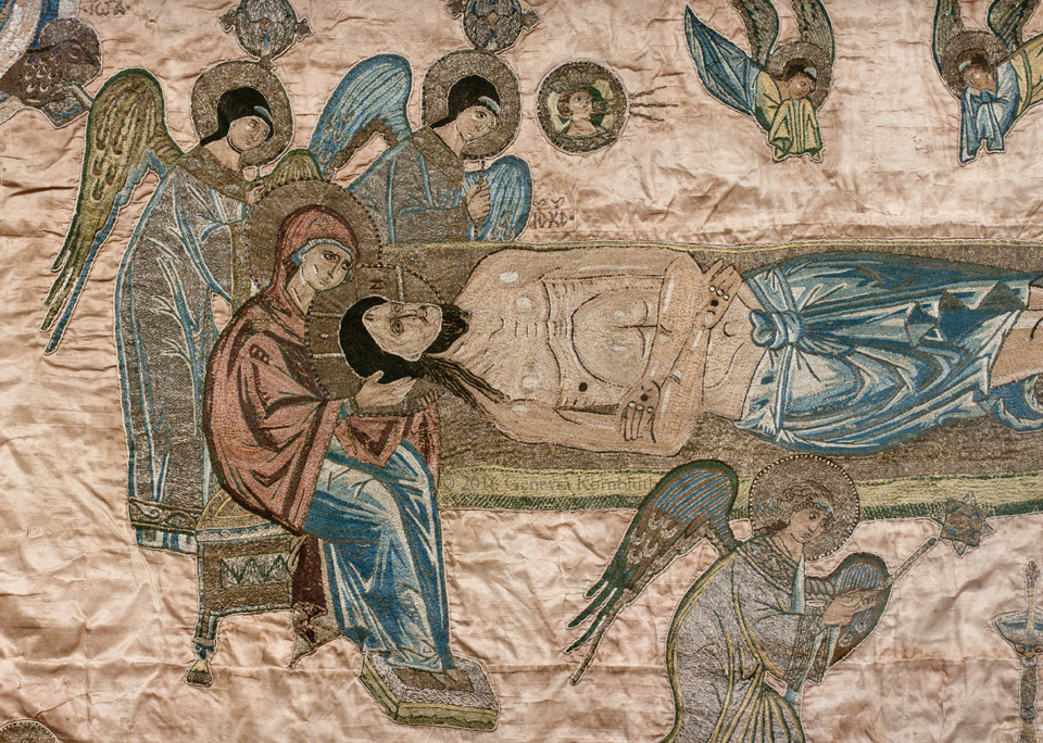 Entombment: Khutyn epitaphios, taffeta with gold/silver/silk embroidery, mid 15th c., workshop of Archbishop Euthymius/Euphemius II (1429–1459), Novgorod AM
