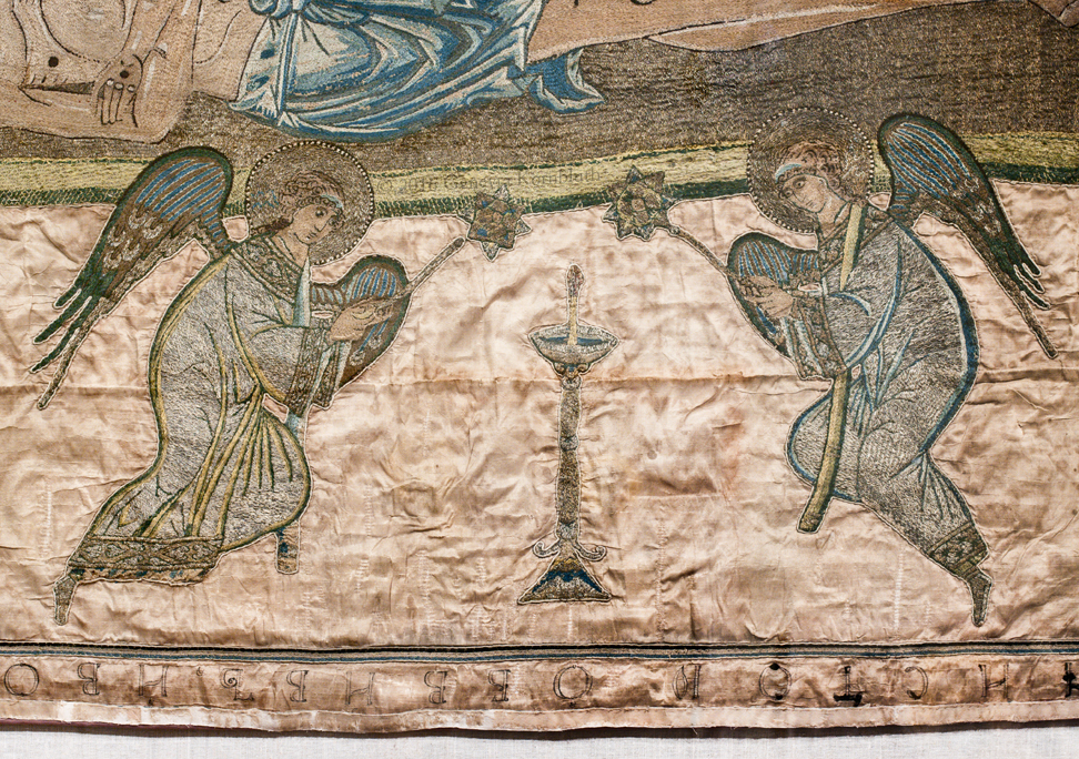 Khutyn epitaphios: angels with flabella and candlestick or fountain