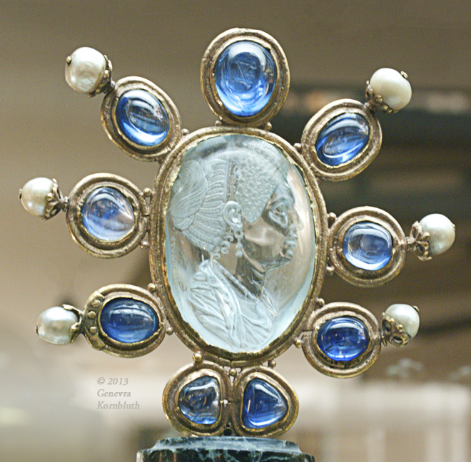 top jewel of "Escrain de Charlemagne", aquamarine intaglio of Flavia Julia Titi (d. 91 CE) (engraved side), sapphires, and pearls in gold, 9th c. (3rd quarter?), CdM Chab. 2089
