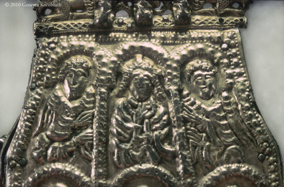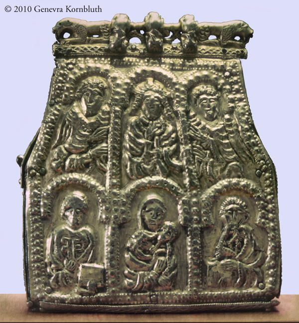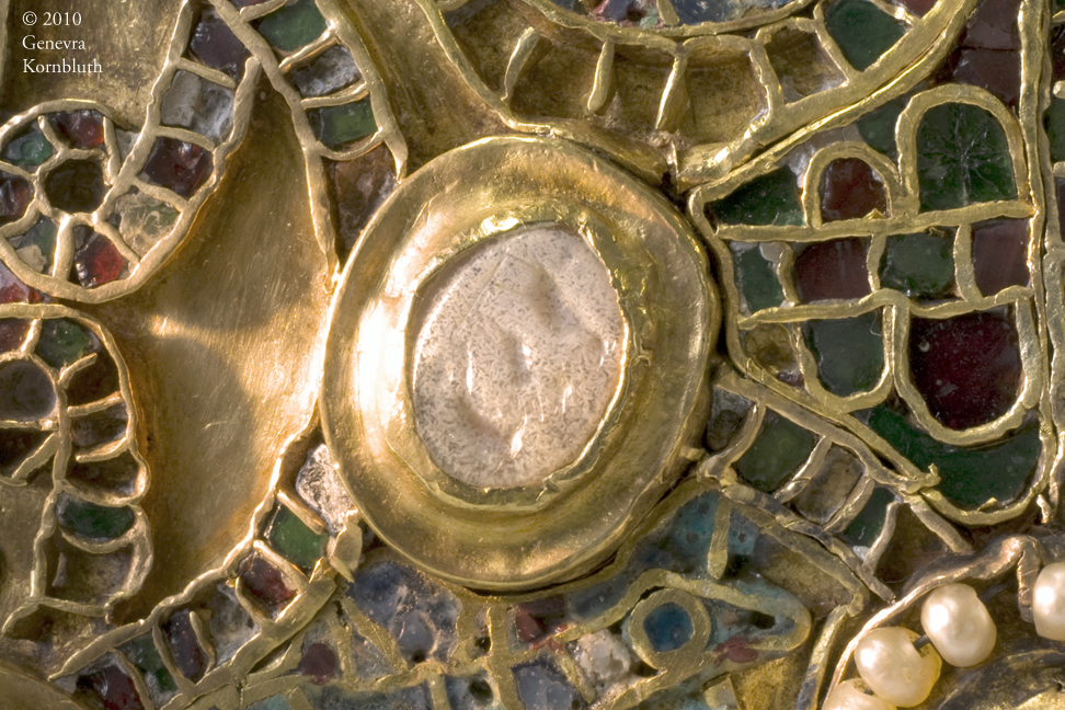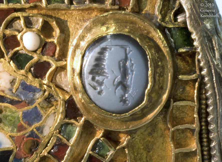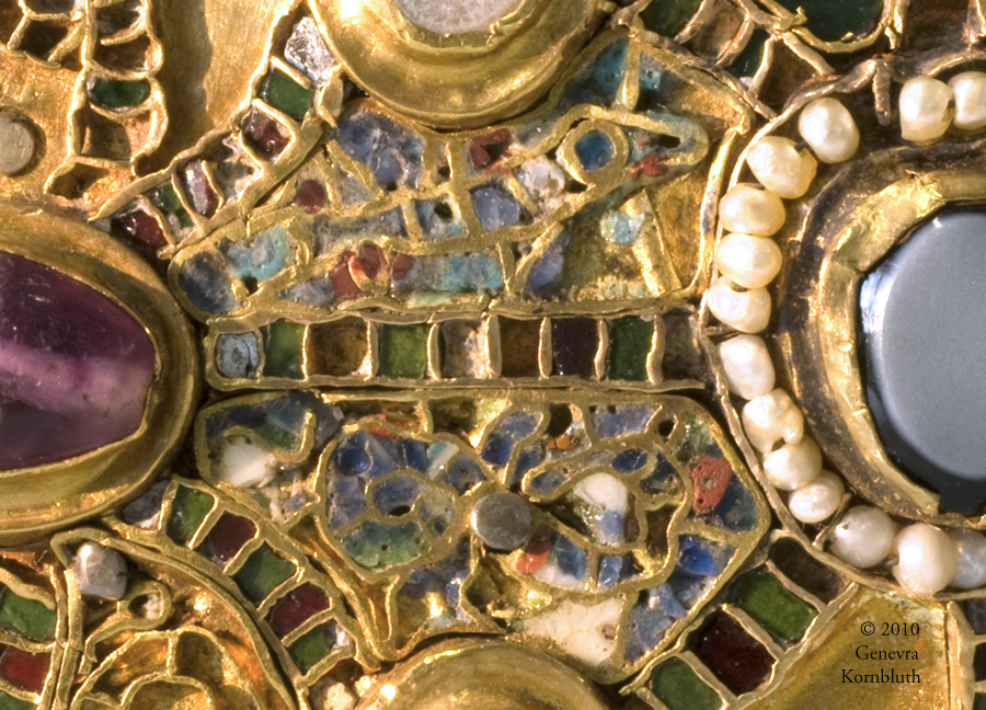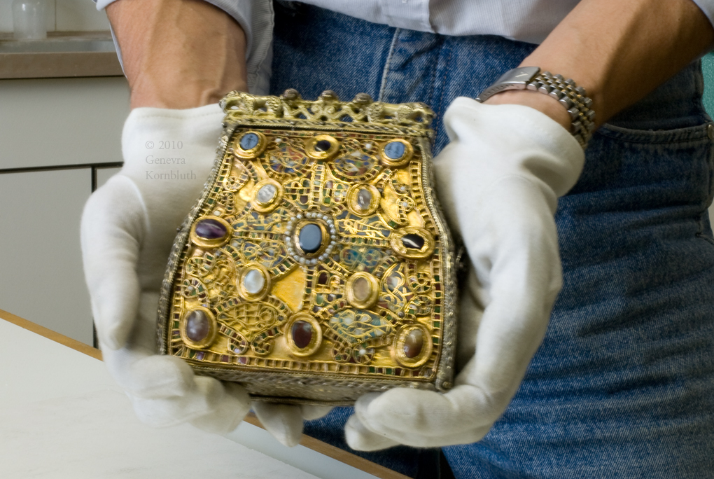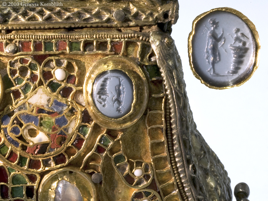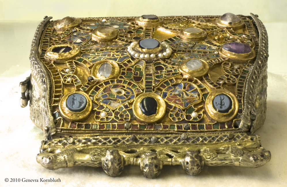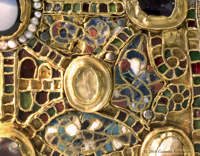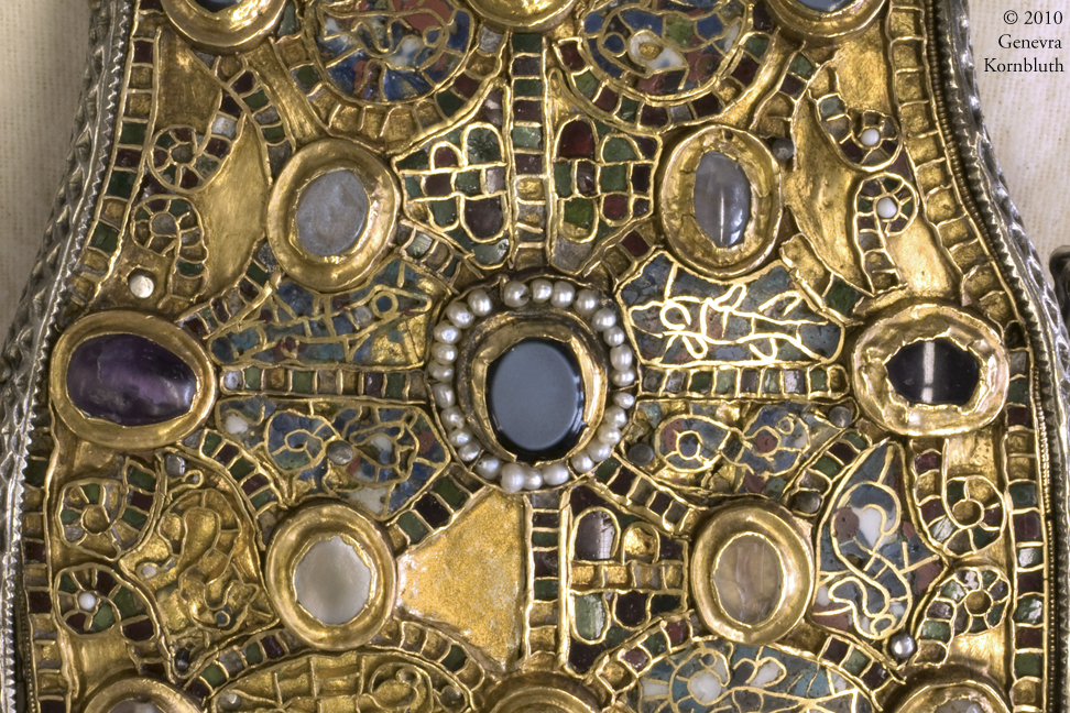 gold, silver gilt, enamel, glass and garnet inlay, and other gems on wood core