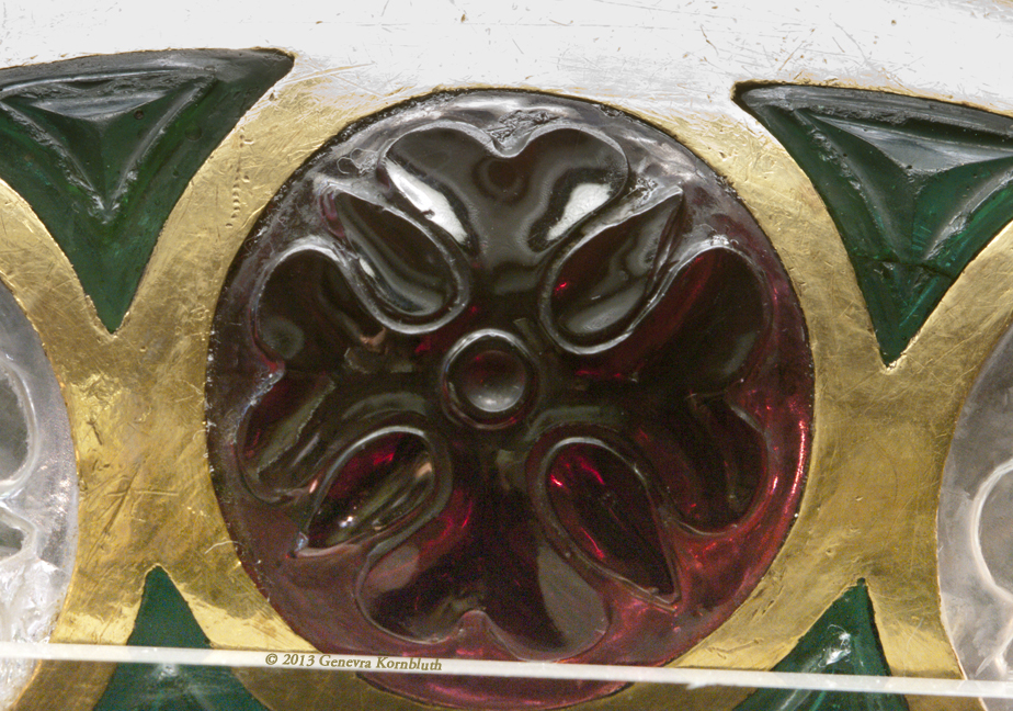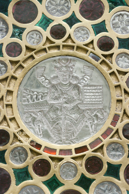 Historical Archive: Cup of Chosroes, Coupe de Chosroès made for the Sassanian king Chosroes I (Khosrau I, Kasra), reg. 531-579 formerly in the treasury of Saint-Denis, known as the Cup of Solomon (Tasse de Salomon) Gold, rock crystal, red and green glass. Diameter 28 cm. Relief on exterior of bowl, interior smooth. Paris, Cabinet des Médailles 56.95, Chab. 2538 |