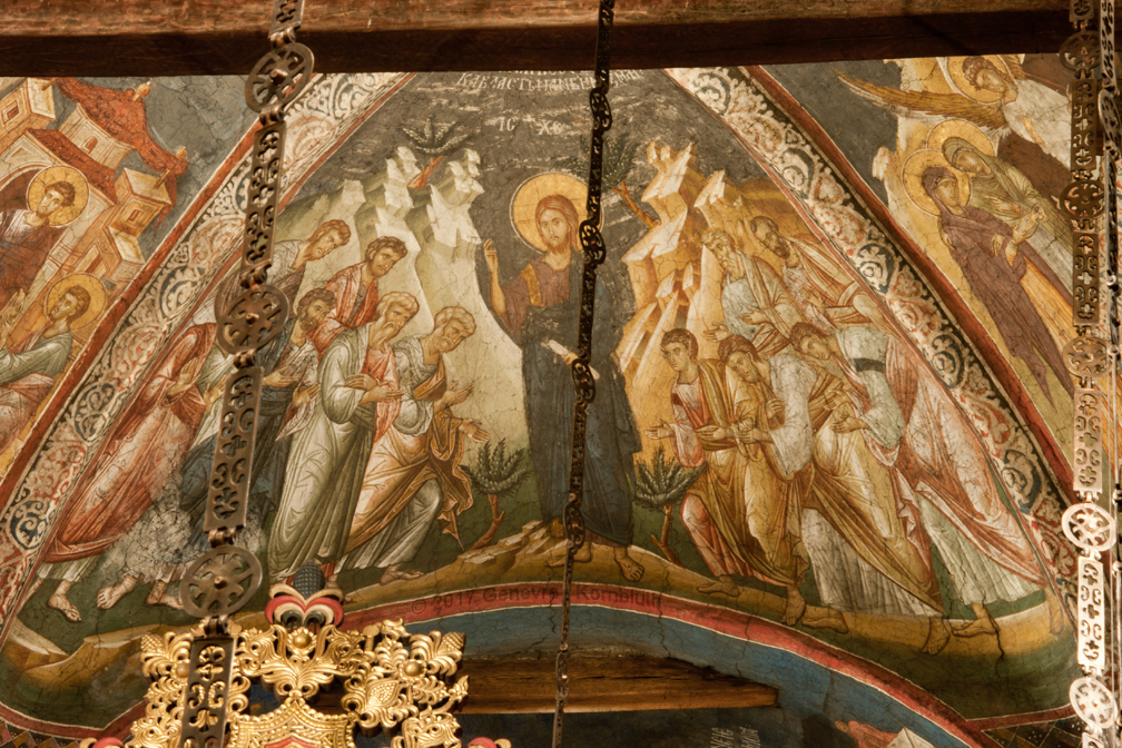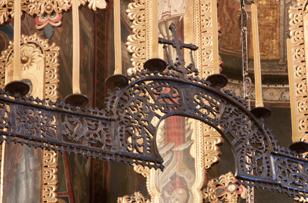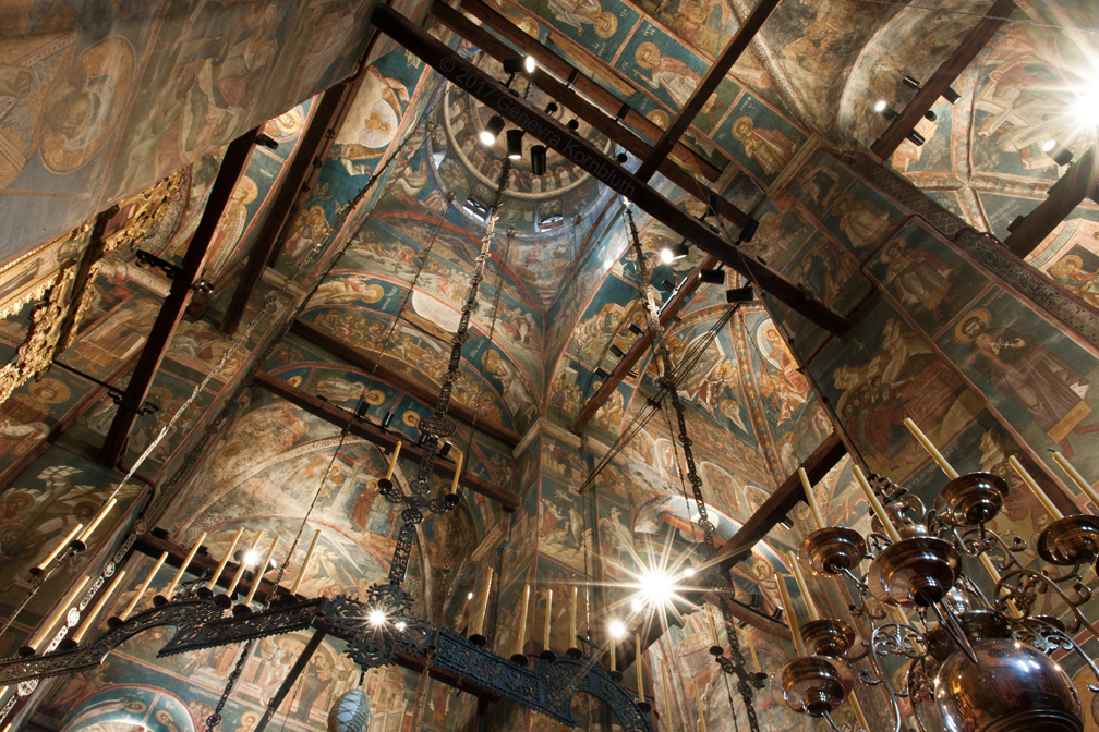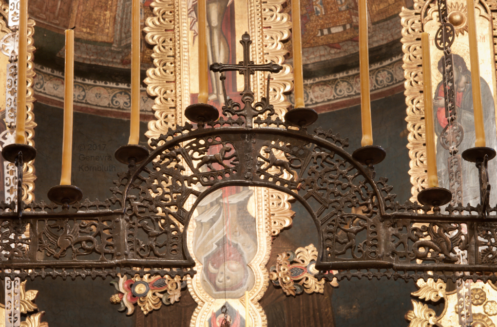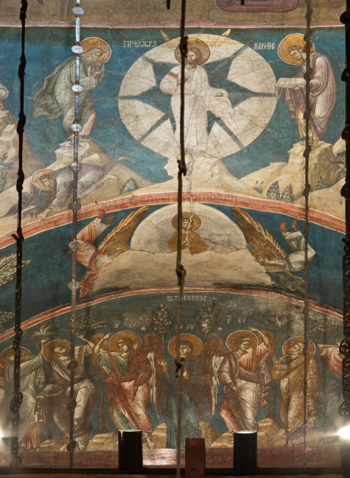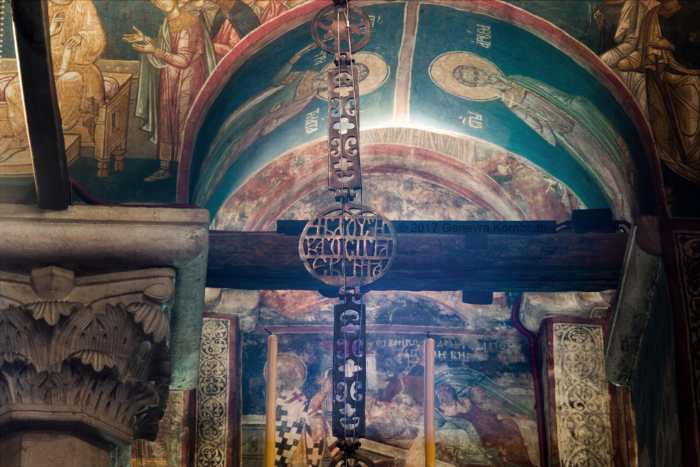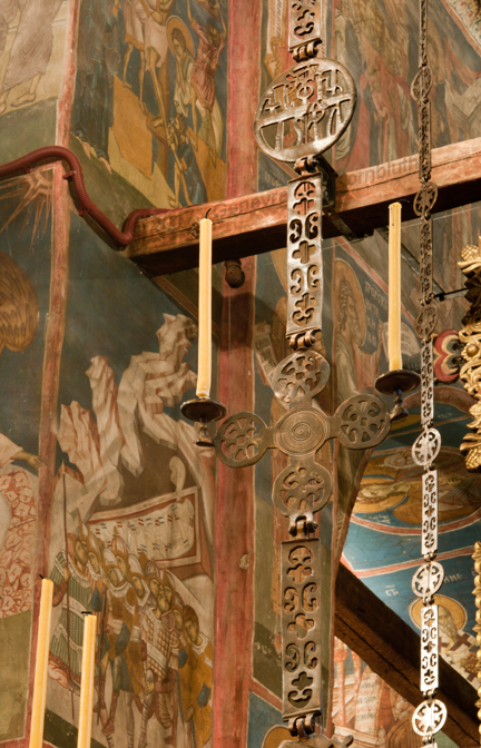 Historical Archive: Visoki Dečani Choros, chandelier On this page, images of frescoes and choros are labeled for choros. bronze and wrought iron; suspension chains 20 meters long (56.6 feet) Suspended white ovoids are ostrich eggs. gift of Stefan Dečanski or Stefan Dušan, before winter 1345 restored by the nun Eugenia/Jevgenija (Princess Milica) 1397 |