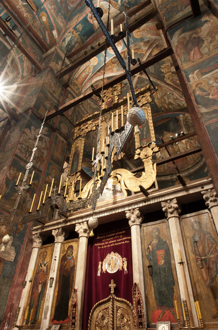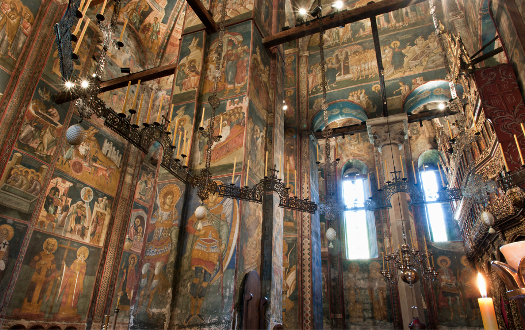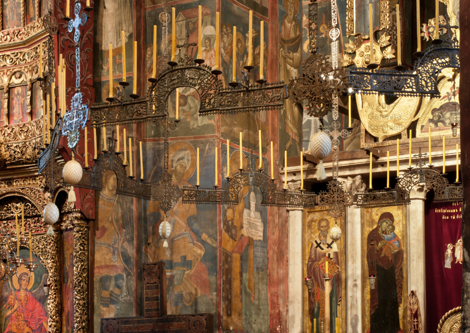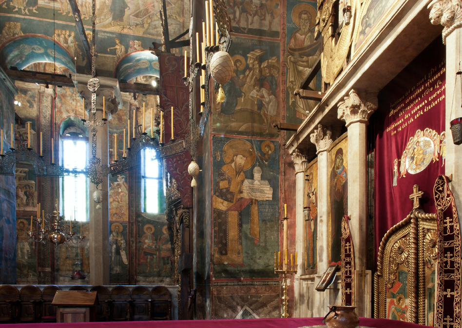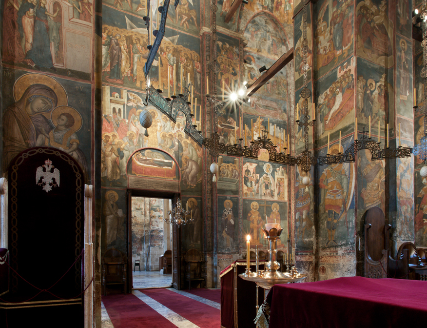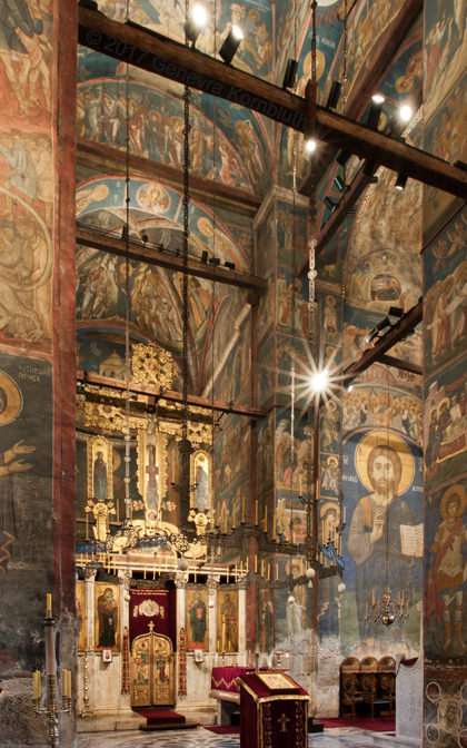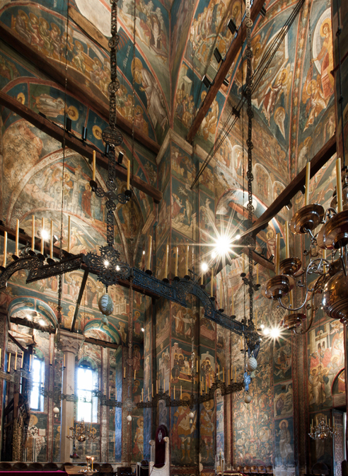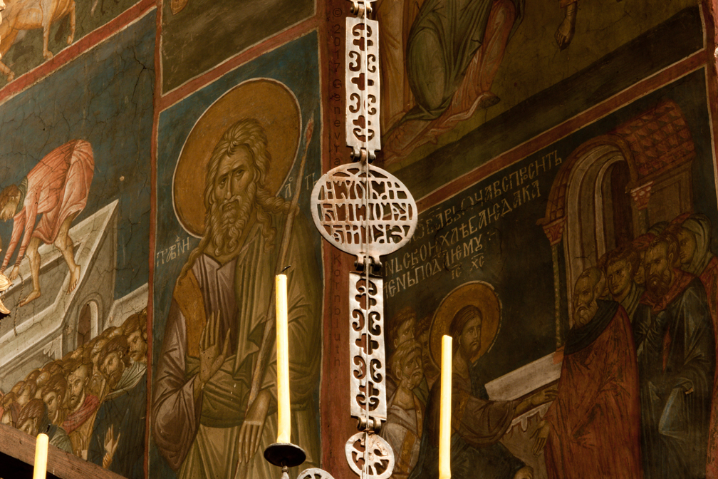 Historical Archive: Visoki Dečani Choros, chandelier On this page, images of frescoes and choros are labeled for choros. bronze and wrought iron; suspension chains 20 meters long (56.6 feet) Suspended white ovoids are ostrich eggs. gift of Stefan Dečanski or Stefan Dušan, before winter 1345 restored by the nun Eugenia/Jevgenija (Princess Milica) 1397 |