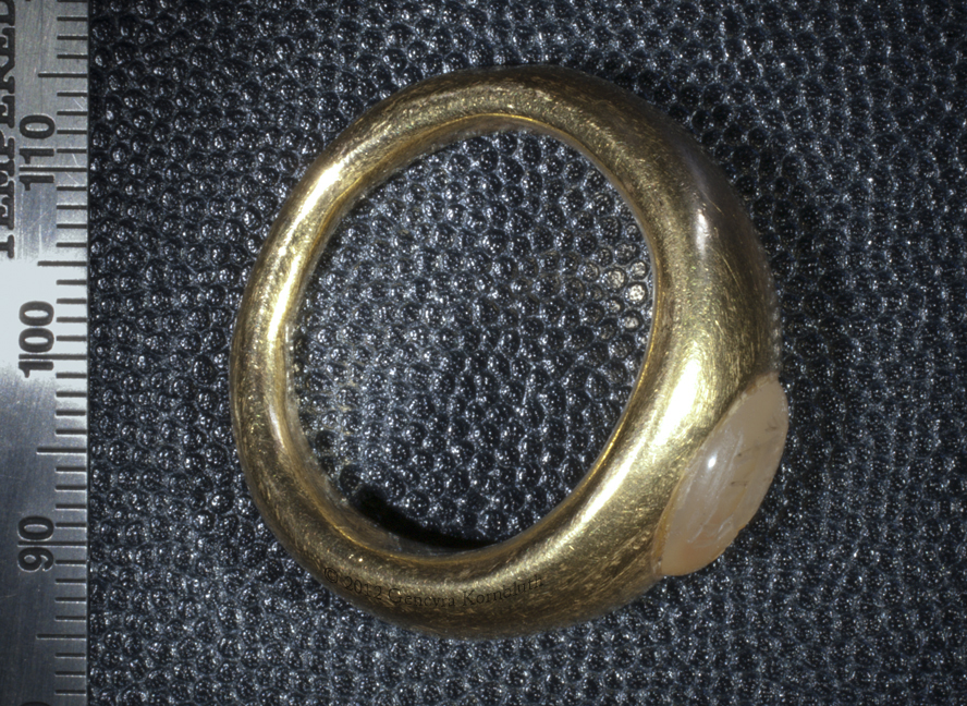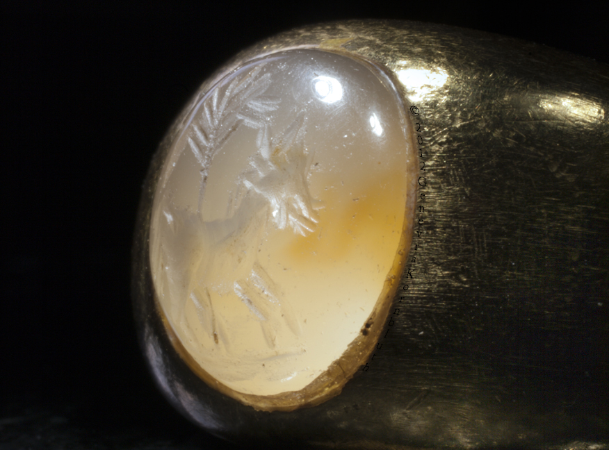 Historical Archive: Donkey seal chalcedony seal, around first century CE, Iran? donkey and palm leaf set in modern hollow gold ring in Roman style collection Sands of Time