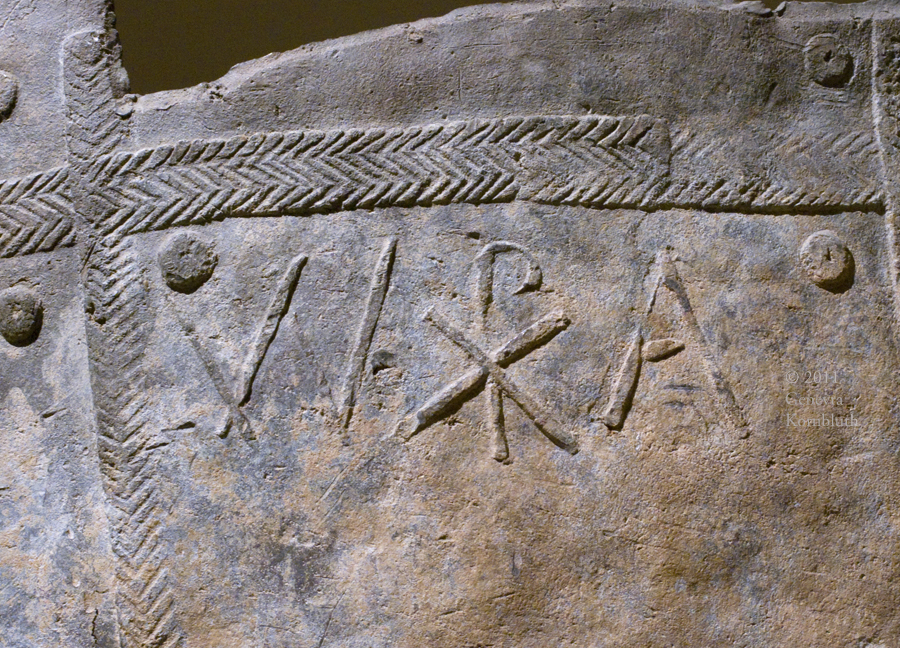 lead tank (font?) from Icklingham (Eng.): Chrismon with omega and alpha, 4th c., BM 1946,0204.1
