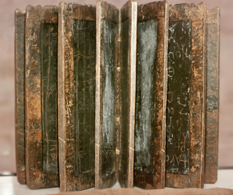 book of wood/wax tablets w. Greek school exercises, Byzantine Egypt 4th-5th c., SMB EgMP P14000. For profile view see Berlin.