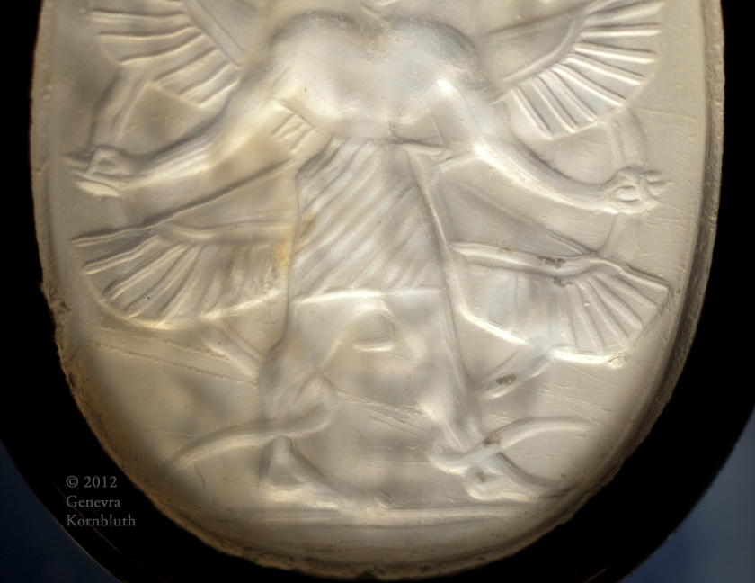 Historical Archive: Fitzwilliam Archaic-Abrasax gem scaraboid cut down in Roman times, in modern ring before 1937 chalcedony, 1.8 x 1.4 x .25 cm; Cambridge, Fitzwilliam Museum CG 518 (Antiquities) obverse: winged figure with two horse-heads, holding serpents, Late Archaic Greek c.500 BCE reverse: magical inscription, 1st-2nd c. CE