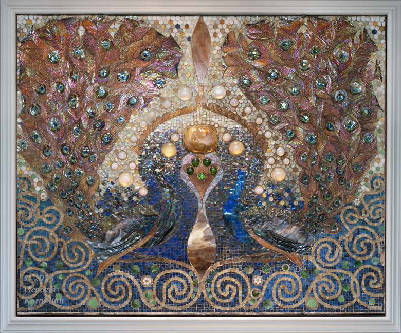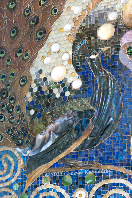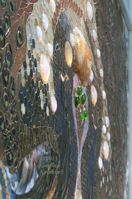Peacock Mosaic from the entrance hall, oblique view showing cabochons
