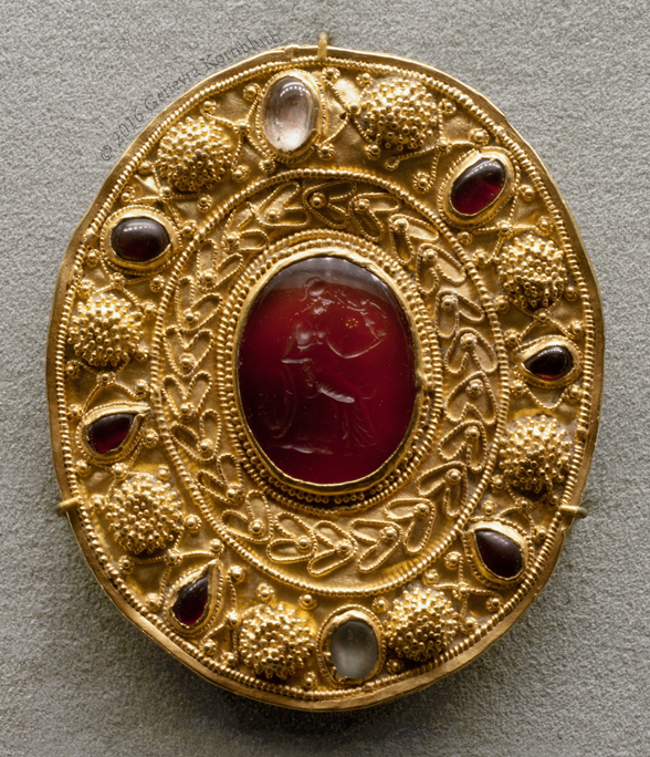 gold/garnet/crystal/glass brooch, late 2nd-early 1st c. BCE, northeastern Black Sea, with Hellenistic carnelian intaglio Athena and Nike, Morgan 2012.2:14