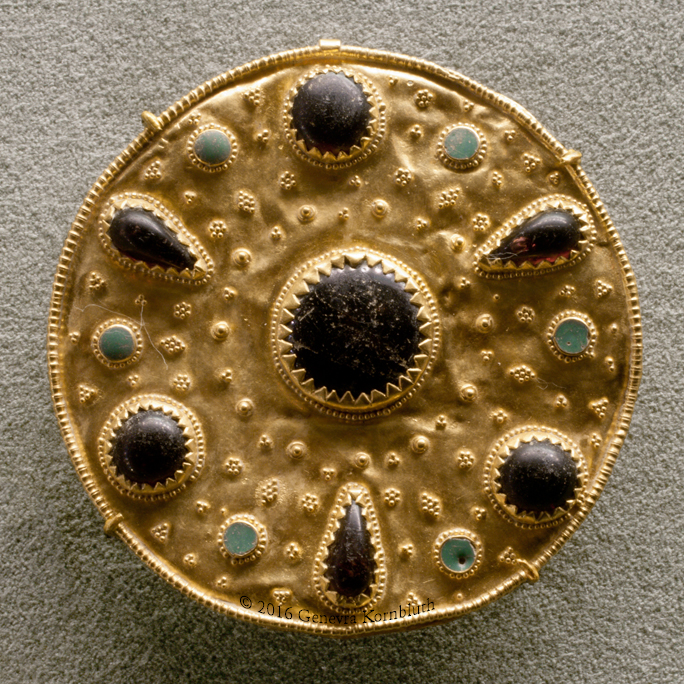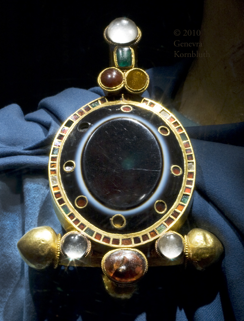 "Kaiserfibel," gold/onyx (layered chalcedony)/rock crystal//garnet/green glass, 5th c., HNM 122/1895.1.-N.70. The Szilágy Somlyó treasure has its own page with oblique view.