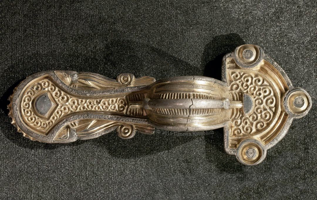 bow fibula from M7 motorway (Hungary) grave 269: silver, gilt, and niello, late 5th c., Kaposvár. For frontal view see this cemetery's page.