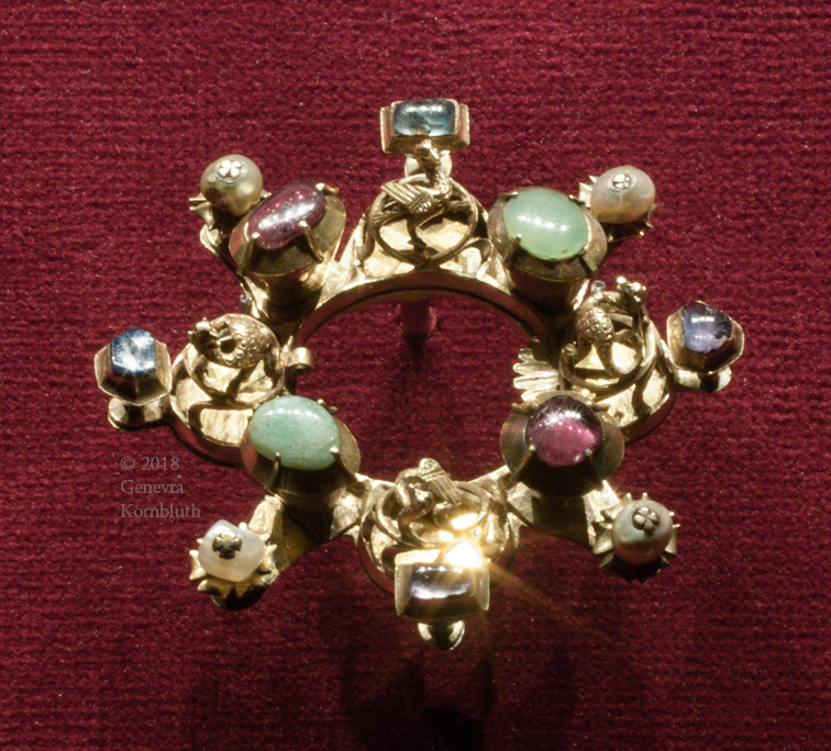 Annular brooch, 14th c. Hungary. Gold, emeralds, pink/blue sapphires, pearls. AIC, loan fr. BM AF.2702