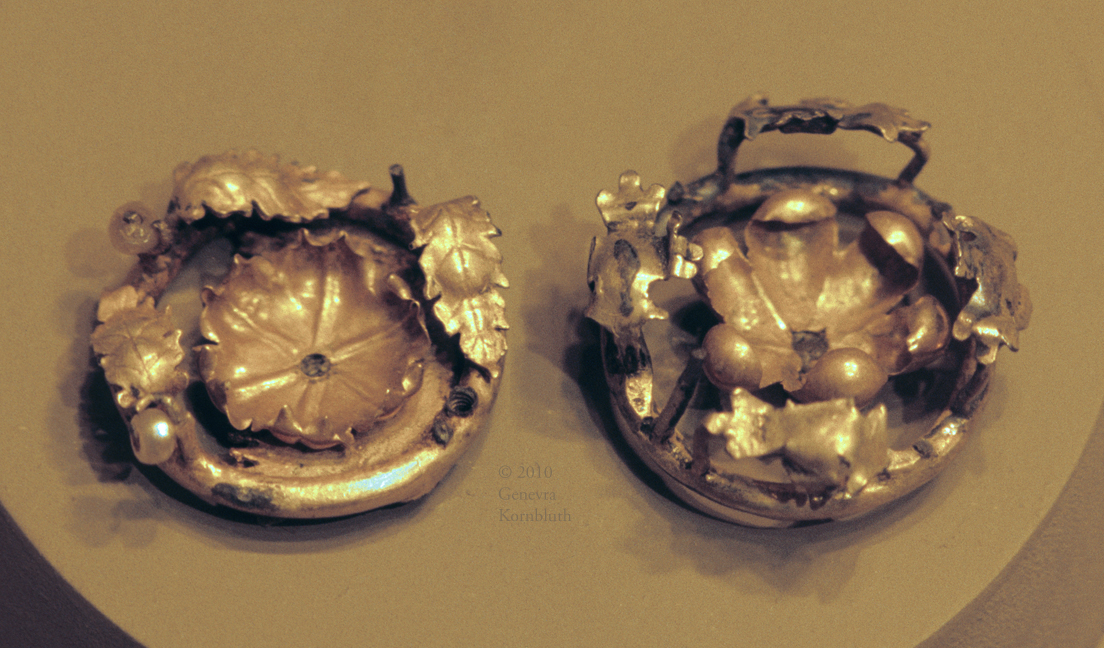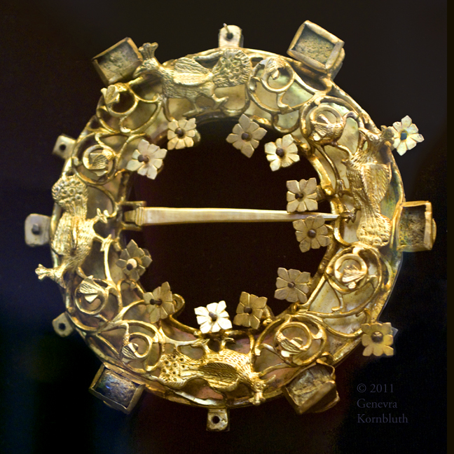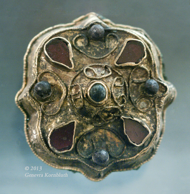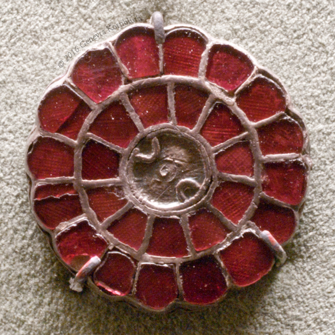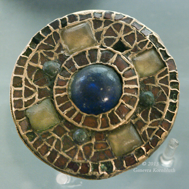 disk fibula, gold, glass, garnet, late 6th-early 7th c., MAHSD. Not available at higher resolution.
