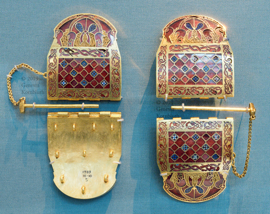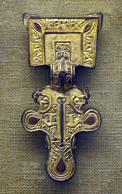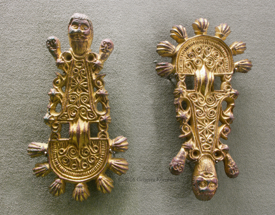 bow fibulae from Szentendre grave 56, c.550-70, displayed as worn, HNM