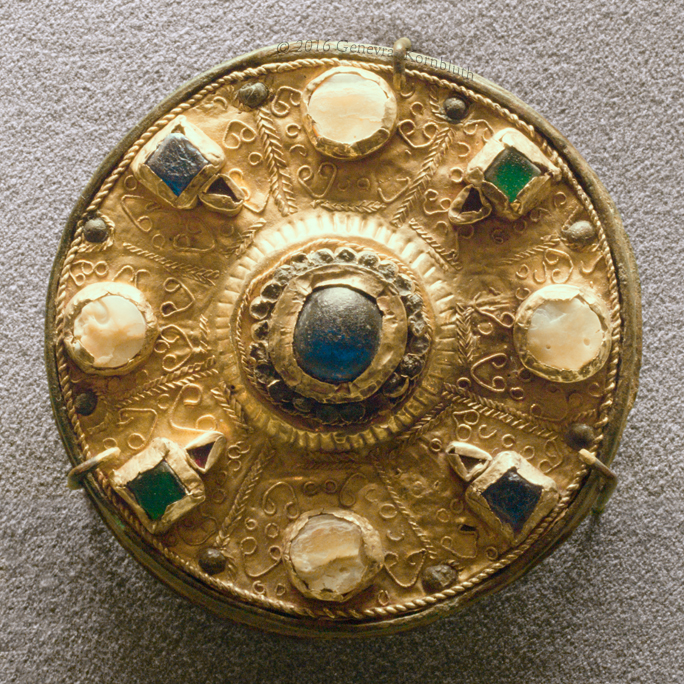 disk fibula from Kings Field, Faversham, Kent, gold and silver-gilt with garnets and glass, 7th c., V&A M.110-1939