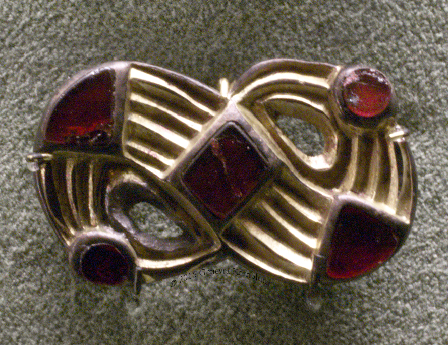 quatrefoil fibula, gold and garnet, 7th c., MAHSD. Not available at higher resolution.