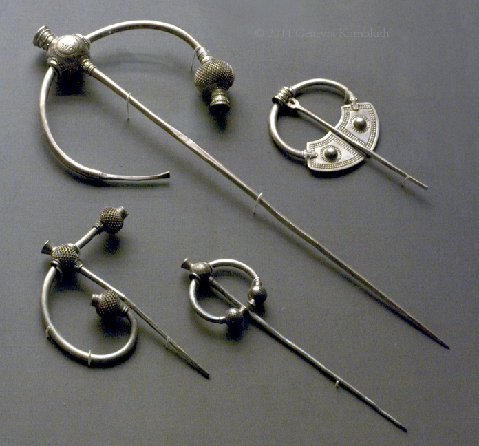 fibulae from Penrith hoard, silver, early 10th c., from Fluskew Pike, Newbiggin, Cumbria, Eng., BM MME 1904,1102.3; 1991,0109.1, .3, .4. For detail and person for scale see BM