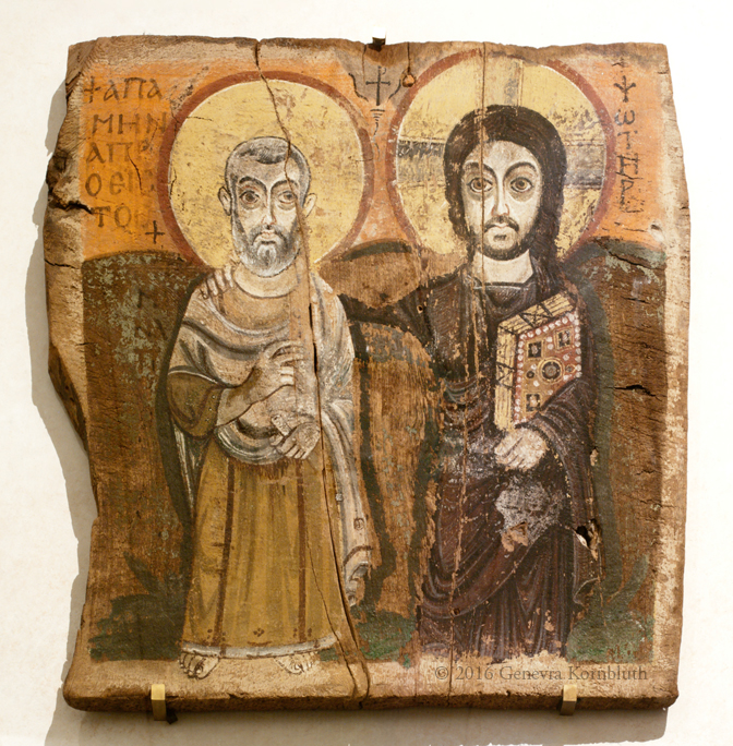 Christ w. Abbot Mena, encaustic, Bawit, 8th c., Louvre E 11565, X 5178. For detail see Louvre.