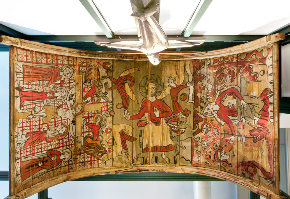 altar baldachin fr. Årdal, painted pine 1275-1300, Bergen 131: Crucifixion w. Peter/Paul, Christ enthroned, Virgin and Child w. St. Margaret of Antioch