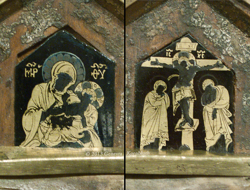 Tablet reliquary, late 13th-c. Mount Athos or Venice; cedar wood, copper alloy, horn, silver, manuscript, glass, beads, gems; MRAH 3225. This work has its own page.