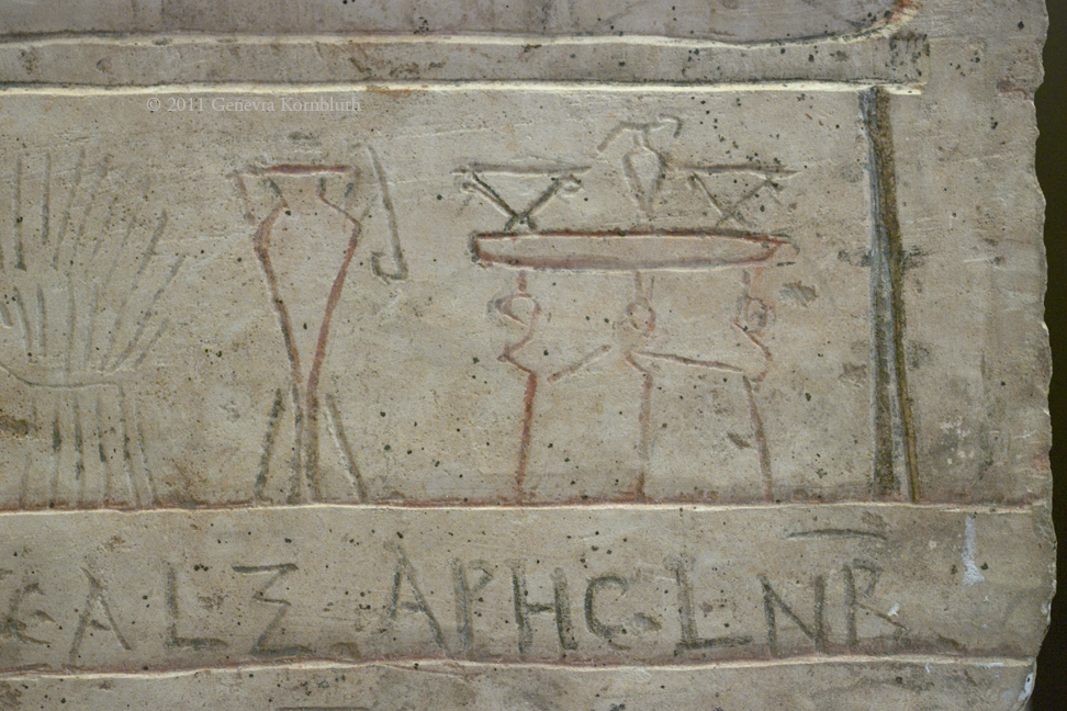 funerary stela of Herakela (age 60) and Ares (age 52), limestone and paint, 2nd-early 4th c. Terenouthis (Egypt), KM 0000.02.1179. For full object and another detail see Kelsey.