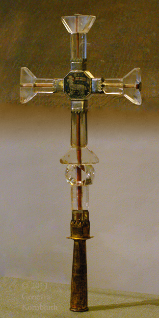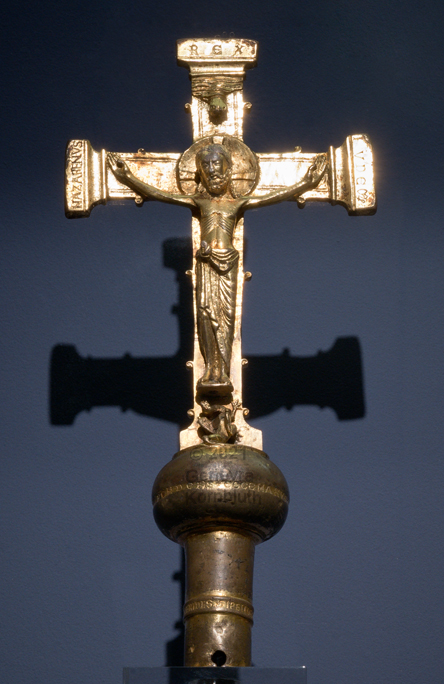 Standing cross, 15th-16th c., Freiburg im Breisgau, Augustinermuseum K13/D. For Carolingian crystal see Frieburg.