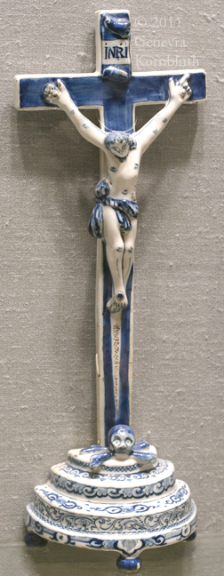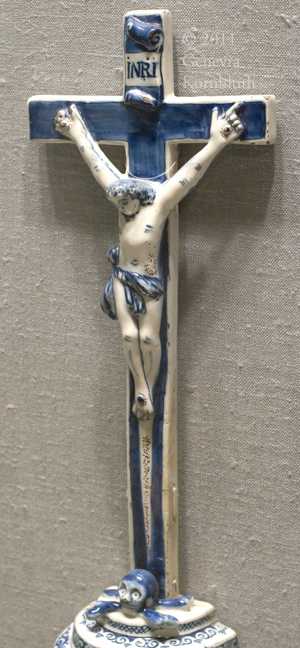 Crucifix, tin-glazed earthenware, De Twee Scheepjes 1707-27 Delft, PMA 1921-3-171,a