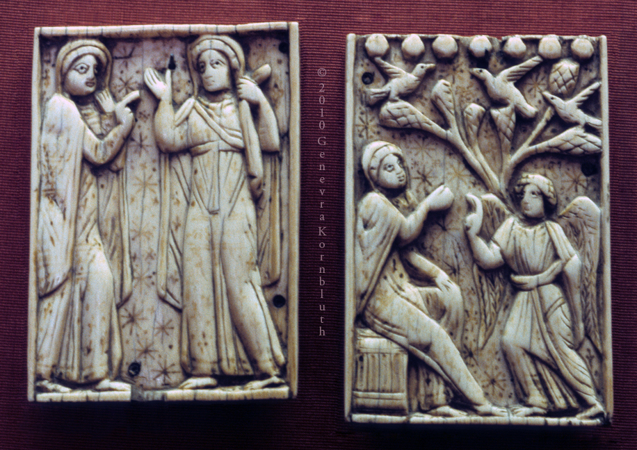 Annunciation, Ordeal, Flight; ivory, 6th c. eastern Mediterranean (Syria?), Louvre OA 11149. Part of same object as Hermitage Visitation/Annunciation to Anna.
