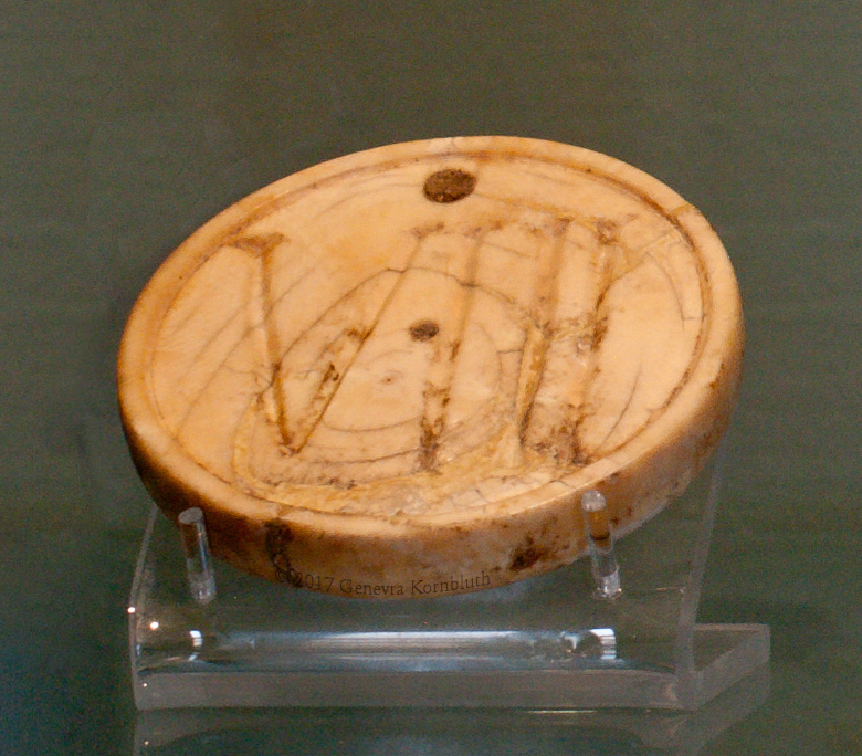 Roman ivory disk game piece with hippocamp and eel, reverse numbered XV and Iε, CdM Froehner 238